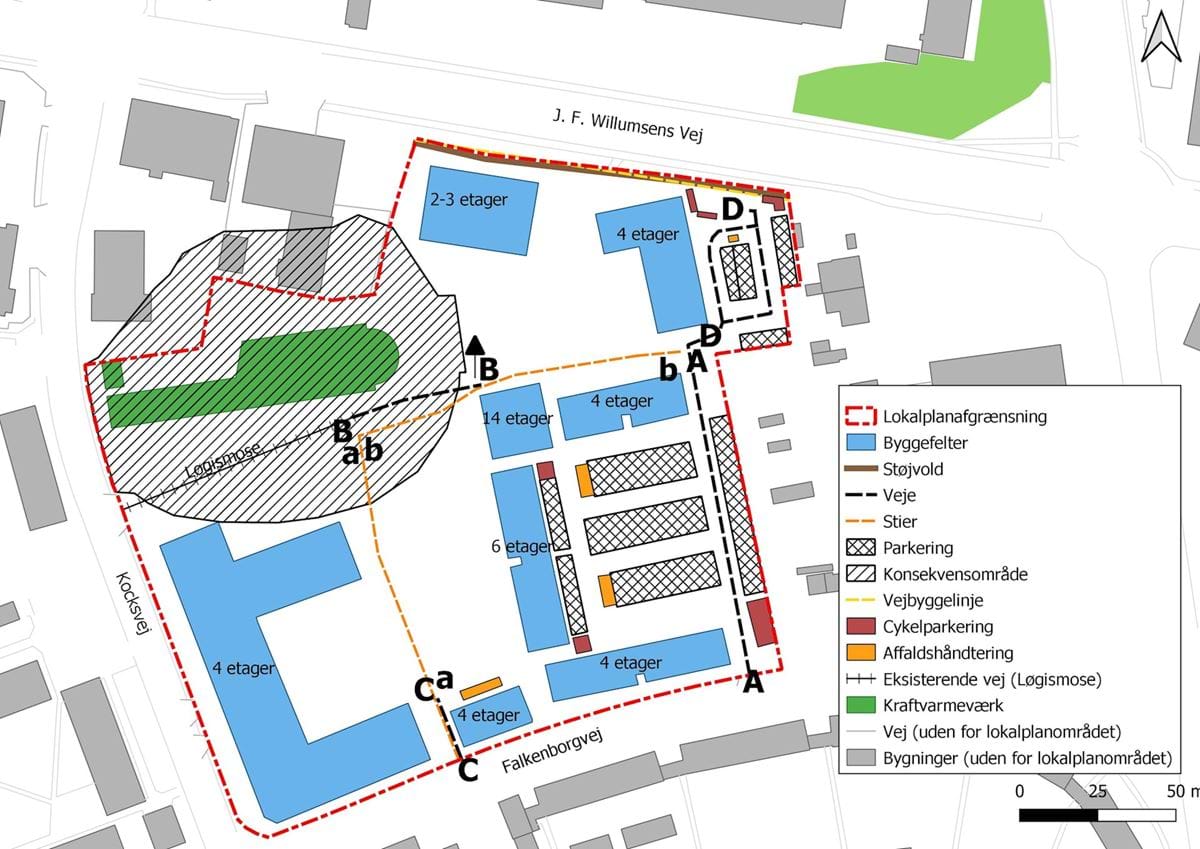 Kortbilag 5 viser byggefelter, vejbyggelinje, støjvold og placering af parkering og affaldshåndtering inden for lokalplanafgrænsningen.