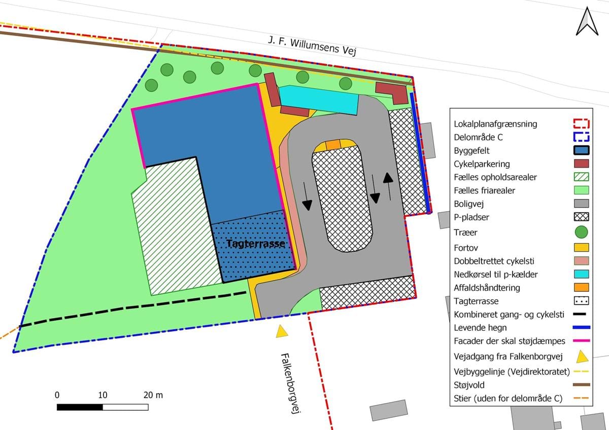 Kortbilag 6 viser arealdisponering inden for delområde C af: byggefelt, vej, sti, parkering og friarealer.