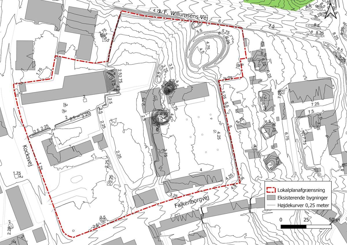 Kortbilag 7 viser højdekurver inden for lokalplanområdet. Kortbilaget viser desuden eksisterende bebyggelse inden for lokalplanområdet.