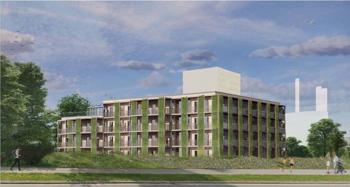 Visualisering 2: Visualisering af eksempel på etagebyggeri i 4 etager med støjvold med en højde på 1,5 meter set fra J. F. Willumsens Vej set fra nordvest.