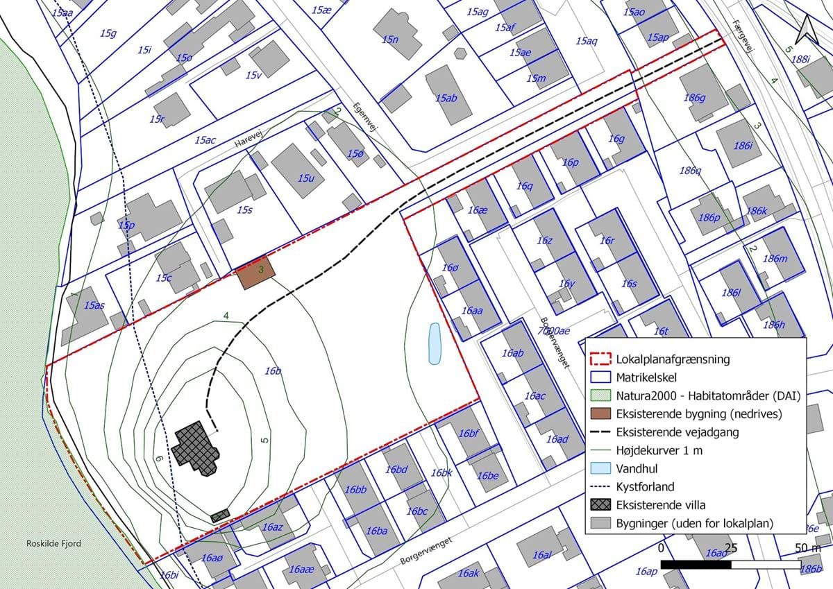 Kortbilag 1 viser lokalplanafgrænsning og eksisterende forhold. Eksisterende matrikelskel er baseret på unøjagtige digitale kort. Den nye lokalplanafgrænsning er baseret på og følger nye opmålinger af matrikelskel.