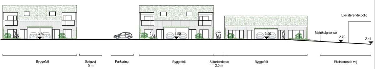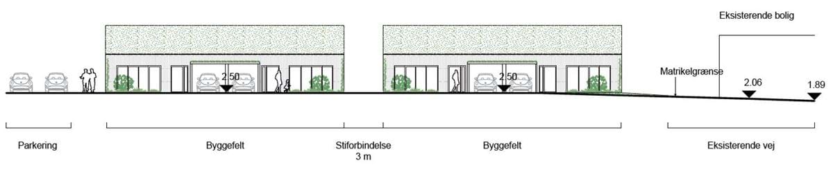 Illustration 1: Tværsnit af terrænregulering i forbindelse med etablering af den nordlige overkørsel til lokalplanområdet.