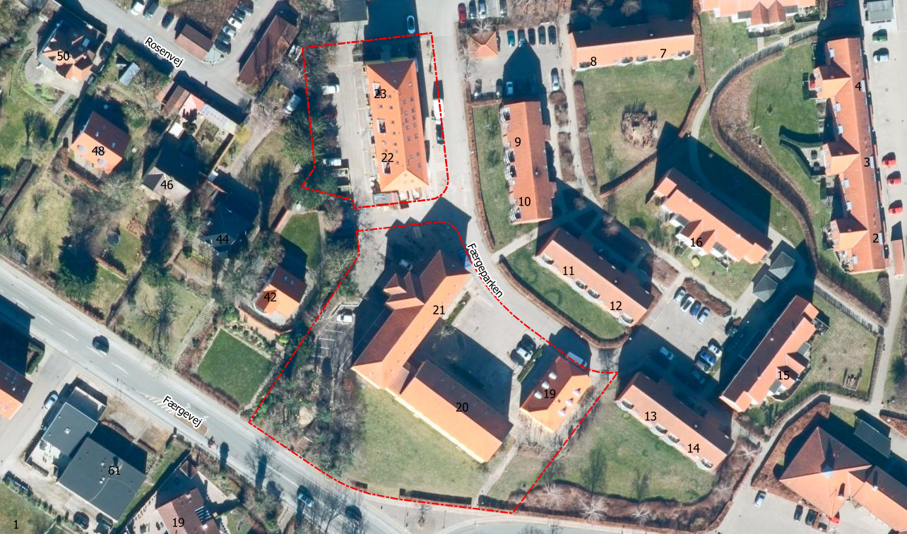Luftfoto fra 2022 med lokalplanafgrænsning og husnummer