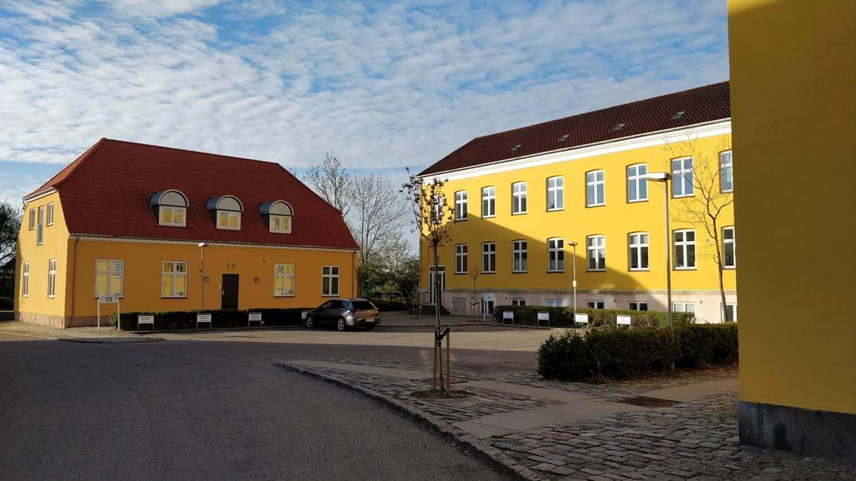 Epidemibygning fra 1891 ses i midten (bygning i 1½ etager). Der blev indrettet 4 boliger i bygningen i 2020.