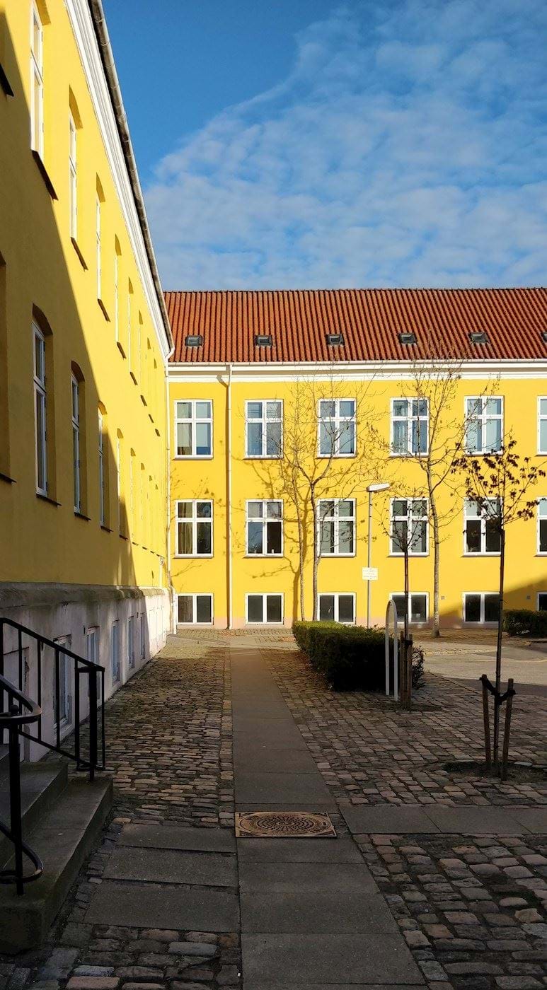 På fotoet ses forbindelsen mellem sygehus (Færgeparken 21) og køkkenbygningen (Færgeparken 22-23) med det høje tag.