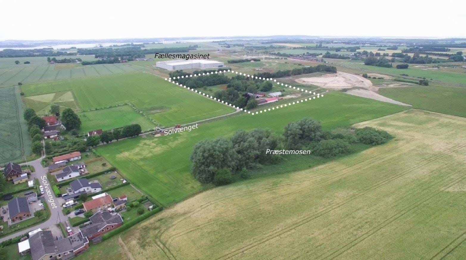 Figur 1: Dronefoto af planområdet, der ligger i Det Grønne Hjerte lige øst for Fællesmagasinet og nord for Solvænget.