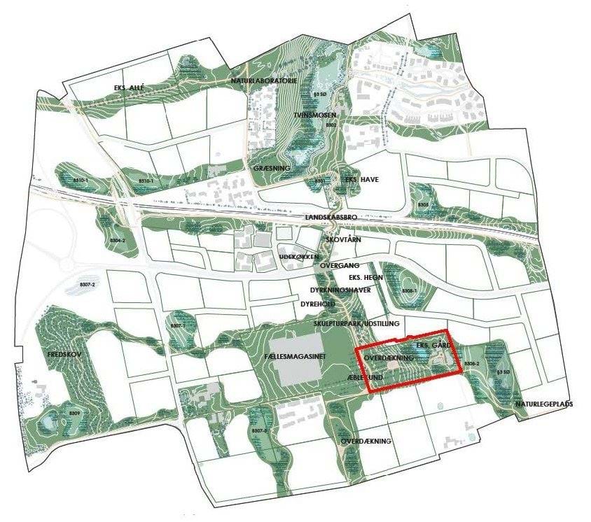Natur og rekreative funktioner er – grundet placeringen i Det Grønne Hjerte - helt essentielle kvaliteter i planområdet. Den overordnede karakter vil derfor være grøn, vild og naturpræget, hvor bebyggelse og anlæg lægger sig ind mellem både eksisterende og ny beplantning, men også brydes af mere åbne landskabsrum med den §3-beskyttede sø, en udsigtsskile, dyrefold o.l. Plejeniveauet skal generelt holdes på et lavt niveau.