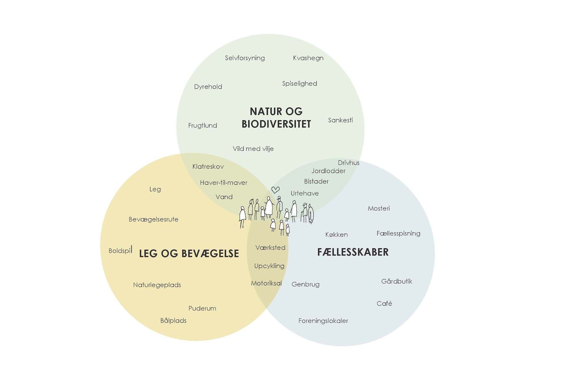 Potentielle fællesinteresser og -funktioner for brugerkredsen grupperer sig under følgende 3 temaer: ’Natur & biodiversitet’, ’Fællesskaber’ samt ’Leg & bevægelse’, jf. figur 3.