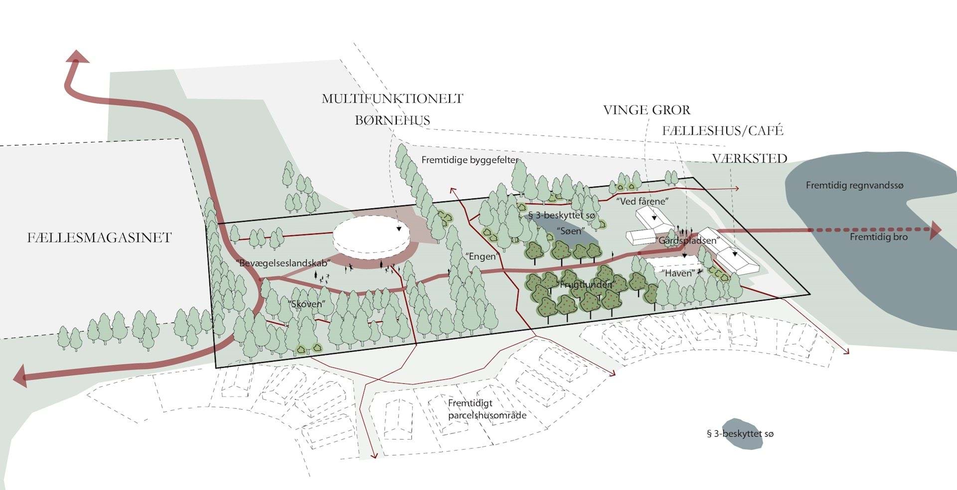 På figur 5 og kortbilag 5 ses en illustrationsskitse, der viser et eksempel på en mulig disponering af børnehus orienteret mod øst, hvorved der kan skabes en naturlig orientering til bebyggelsen i fællesskabsområdet og en fysisk opkobling til den tværgående adgangssti.