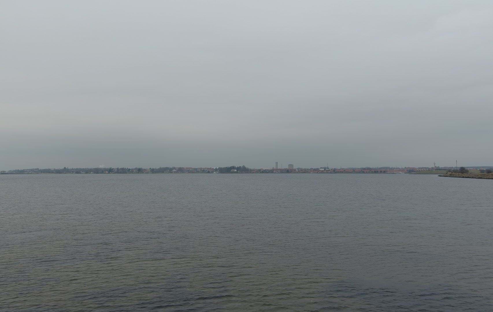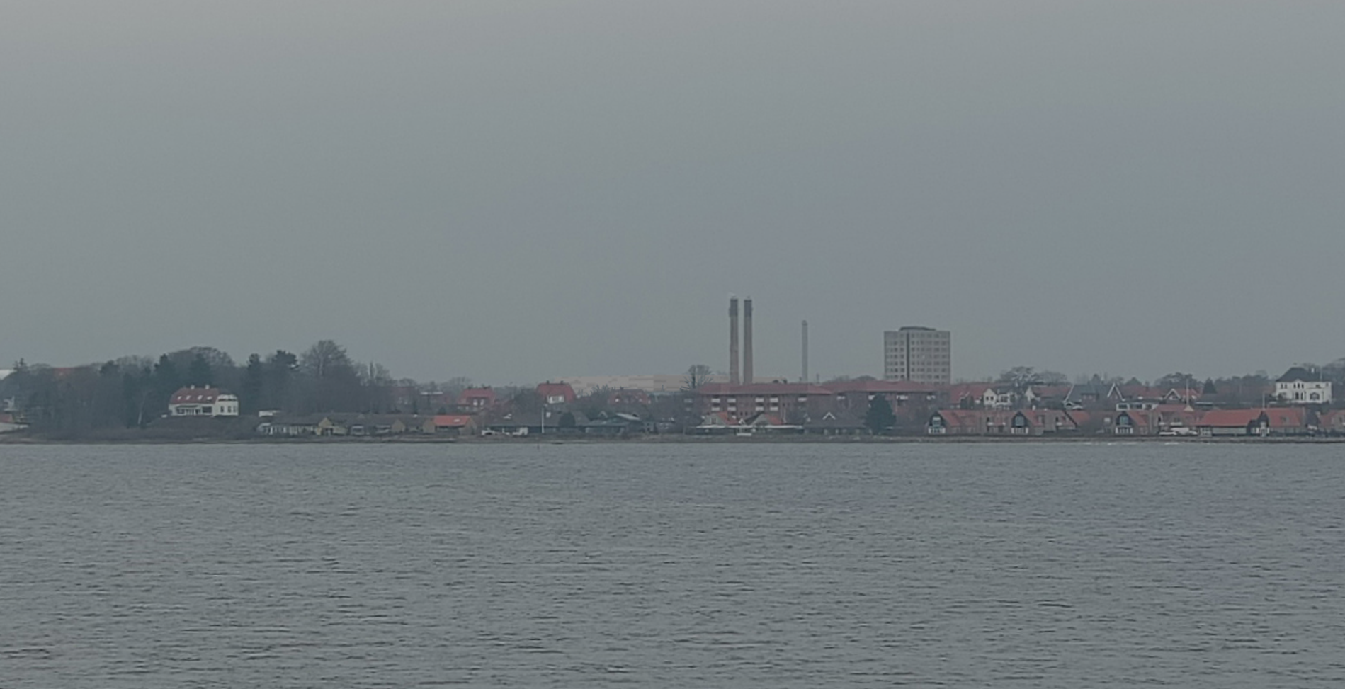 Kystlinjen for Frederikssund by med visualisering af ny bebyggelse i 25 meters højde til venstre for skorstene tilhørende fjernvarmeværket. Visualiseringen er lavet 2,6 km fra bebyggelsen.