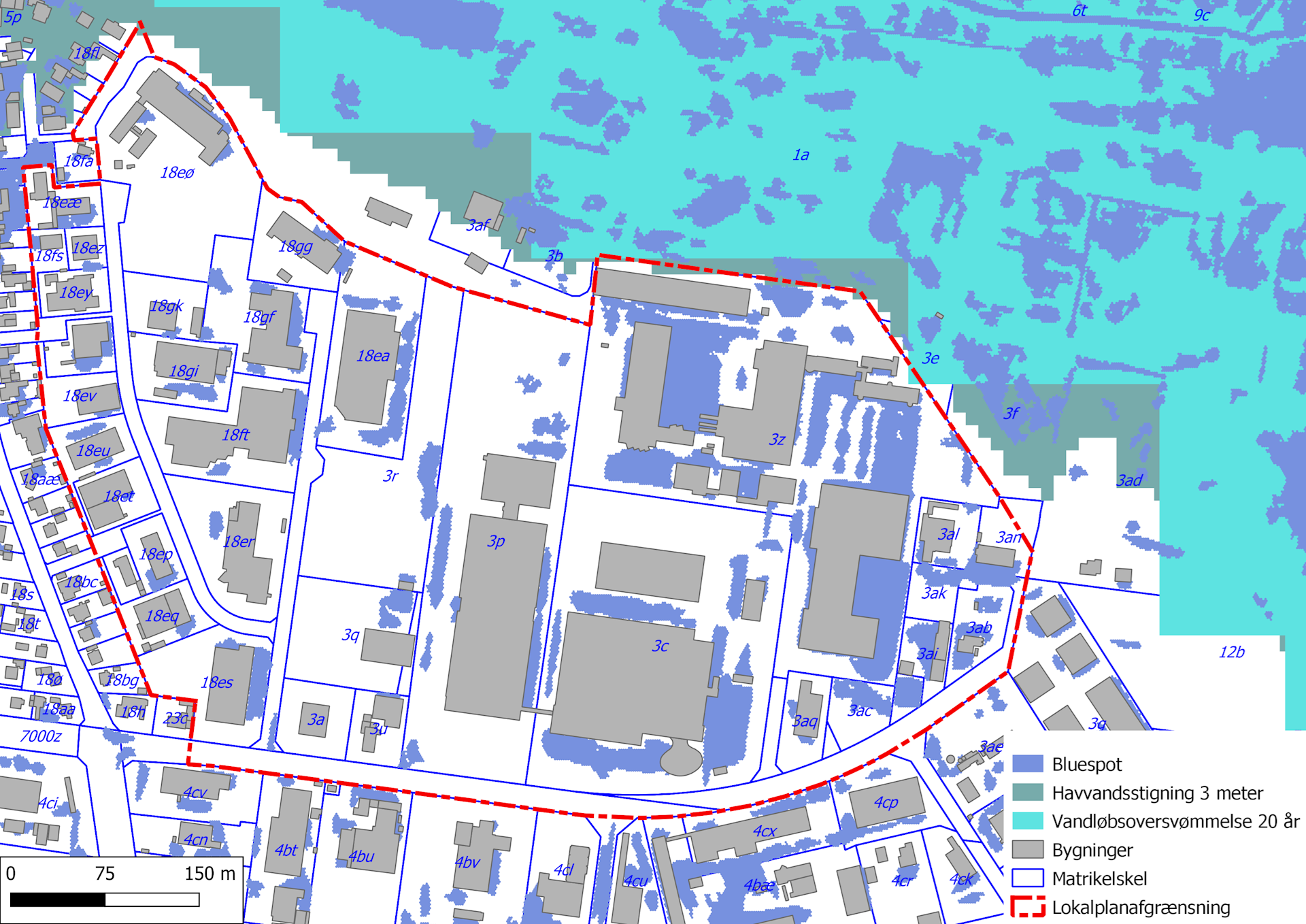 Ovenstående kort viser, at der indenfor lokalplanområdet er mindre områder i den nordøstlige del, hvor der er risiko for oversvømmelse ved havvandsstigninger til kote 3 og vandløbsoversvømmelse ved en 20-årshændelse. Dette er mindre områder, der ikke er bebyggede.