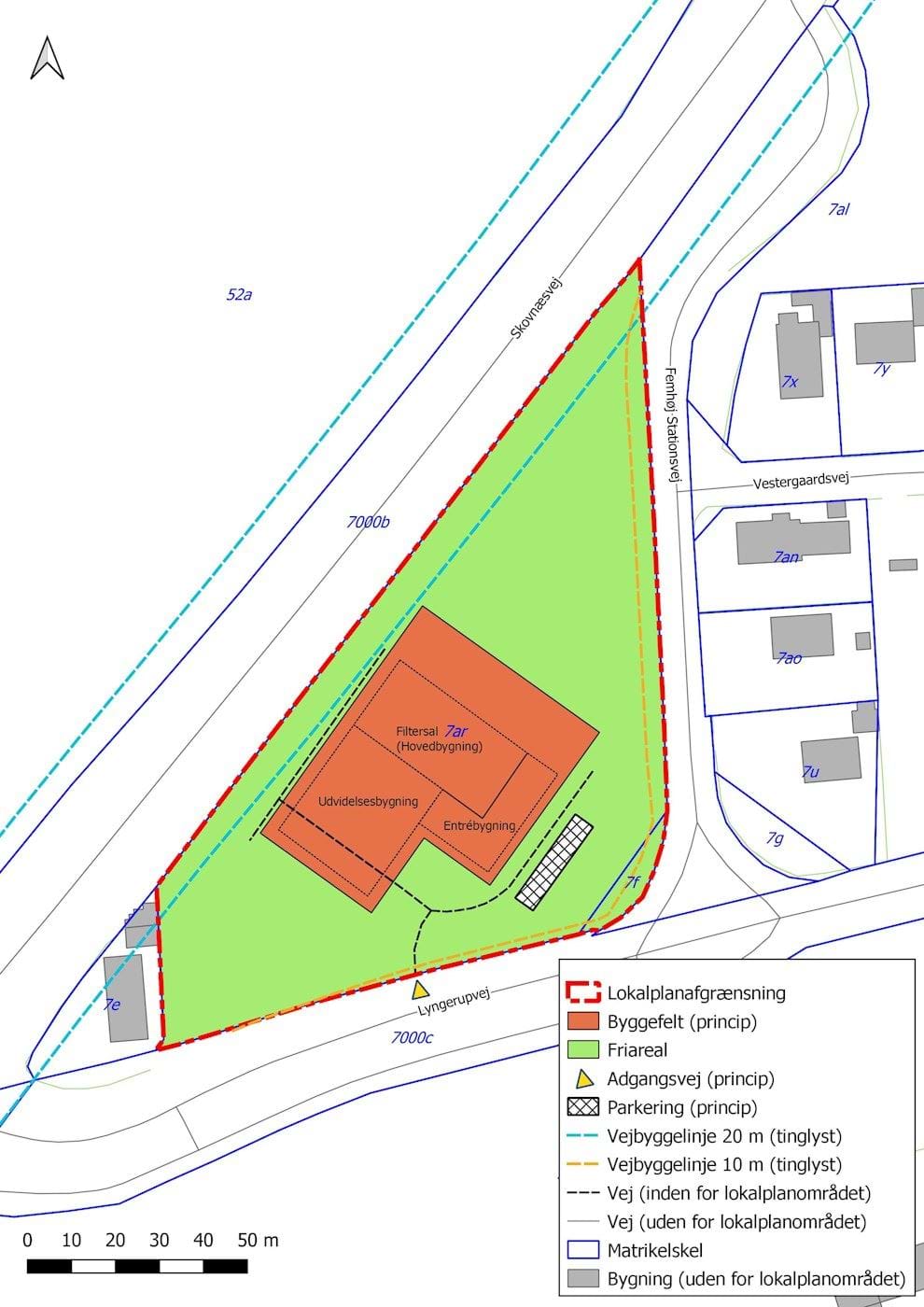 Kortbilag 2: Viser byggefelt, vejforhold, overkørsel samt friarealer.