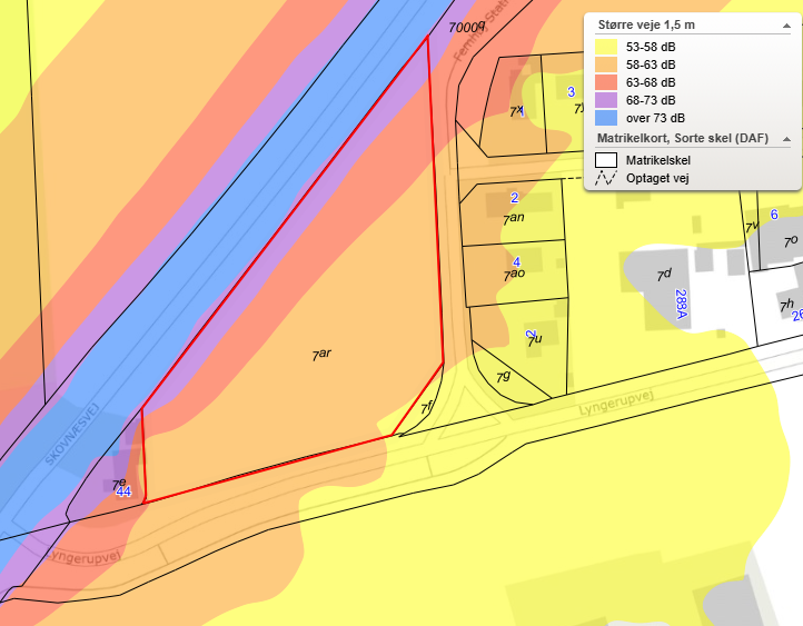 Lokalplanområdet belastet af trafikstøj fra Skovnæsvej, hvilket kan aflæses på støjkonturen for Skovnæsvej vist på konturen nedenfor.