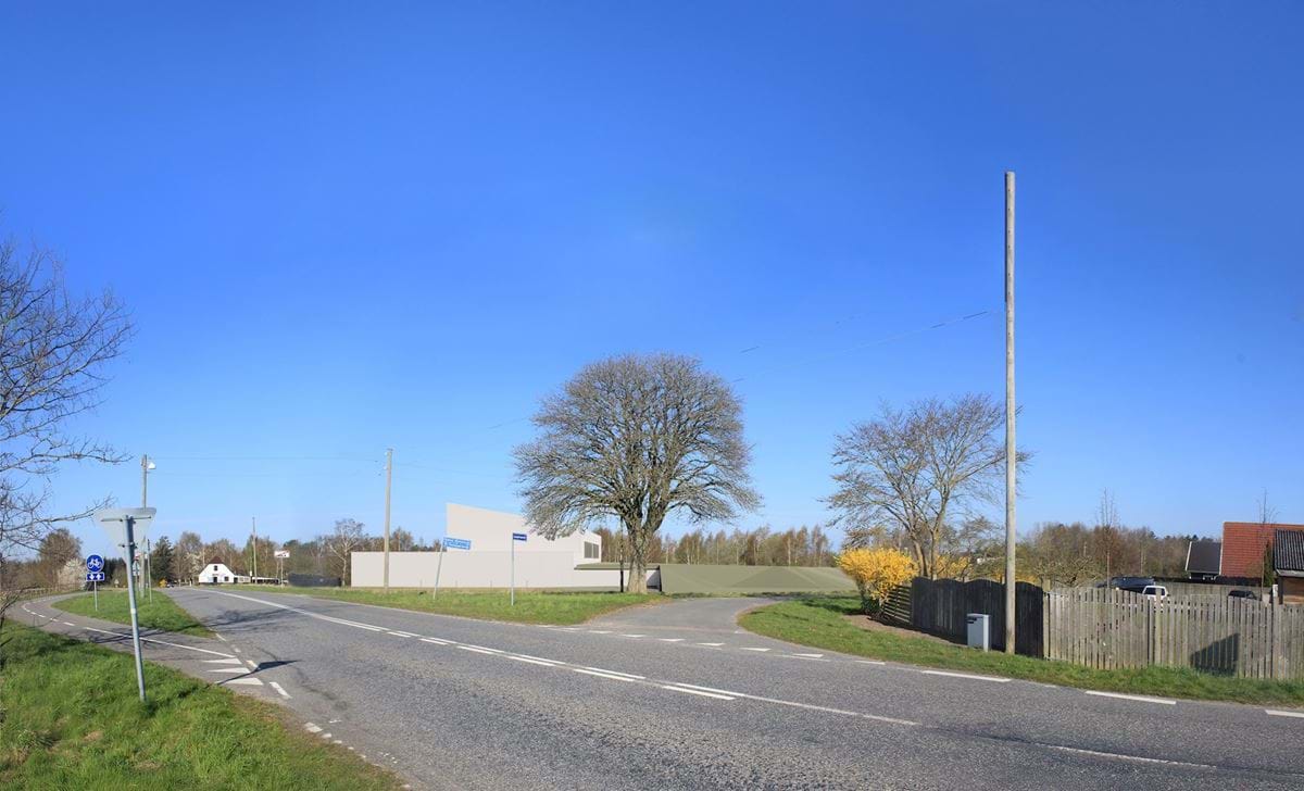 Visualisering 7: Eksempel på mulig bebyggelse med udvidelse set fra sydøst fra t-krydset ved Lyngerupvej.