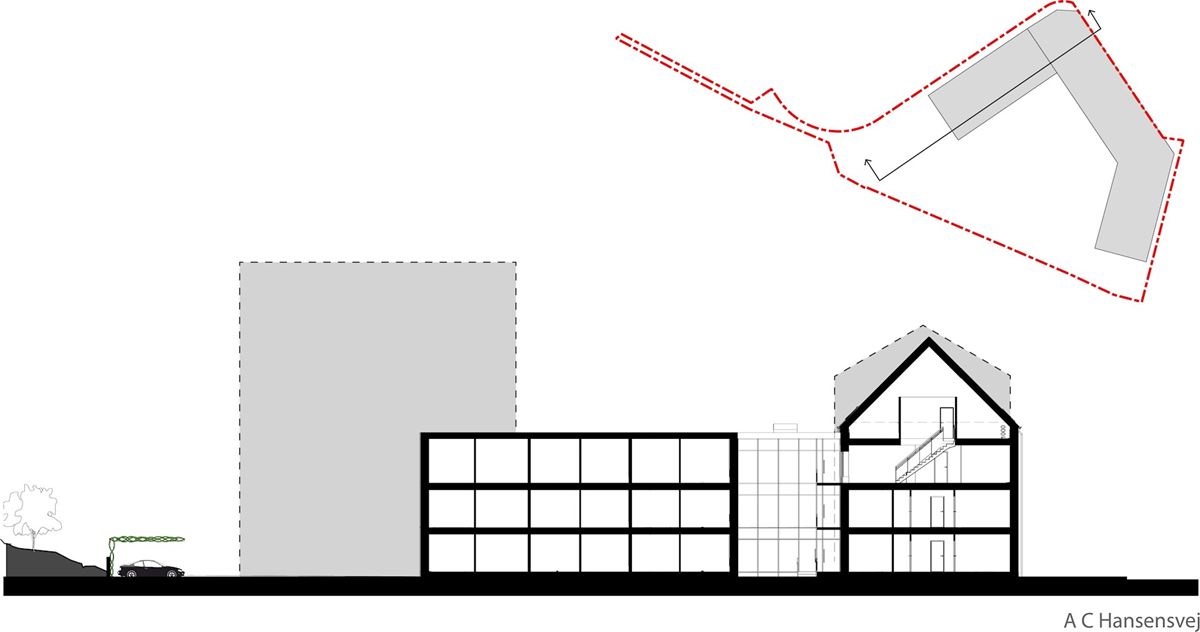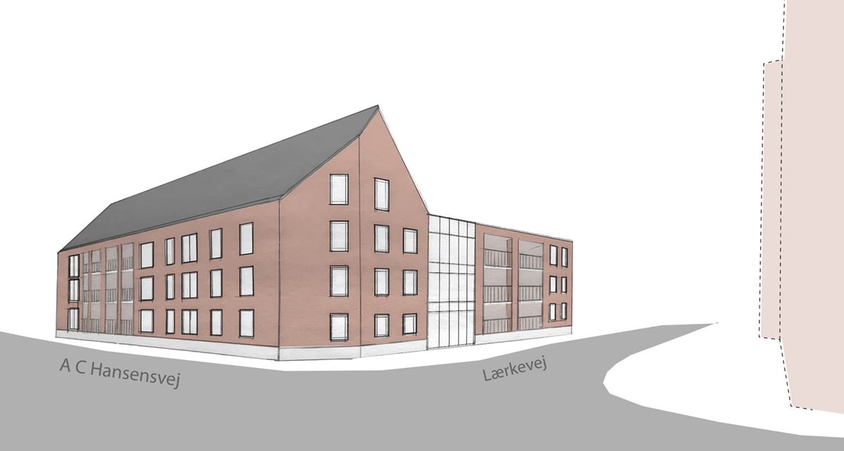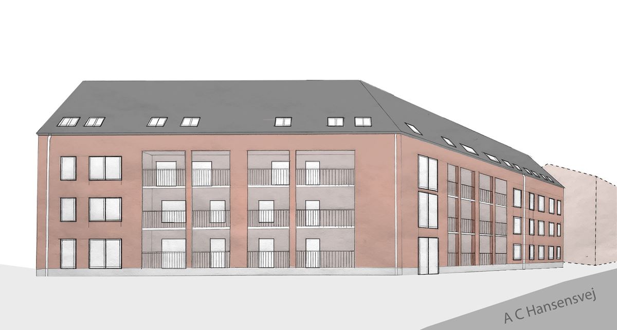 Illustrationen viser en etageejendom, som lokalplanen giver mulighed for at opføre, set fra A C Hansensvej, kørende mod vest.