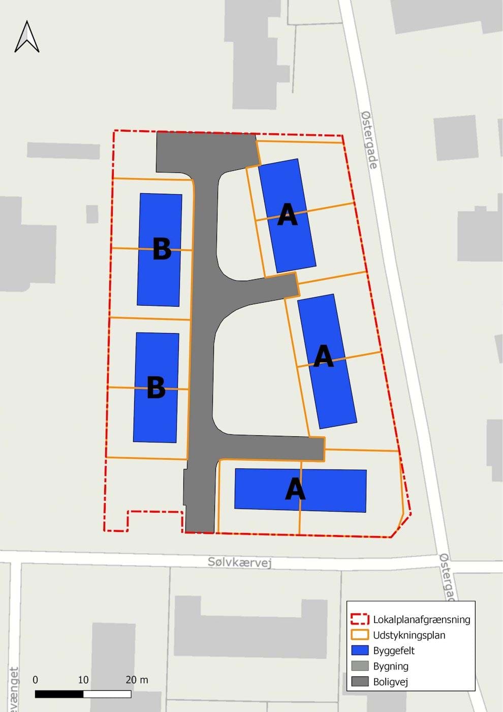 Kortbilag 2 viser byggefelterne som er inddelt i A og B byggefelter og udstykningsplan.