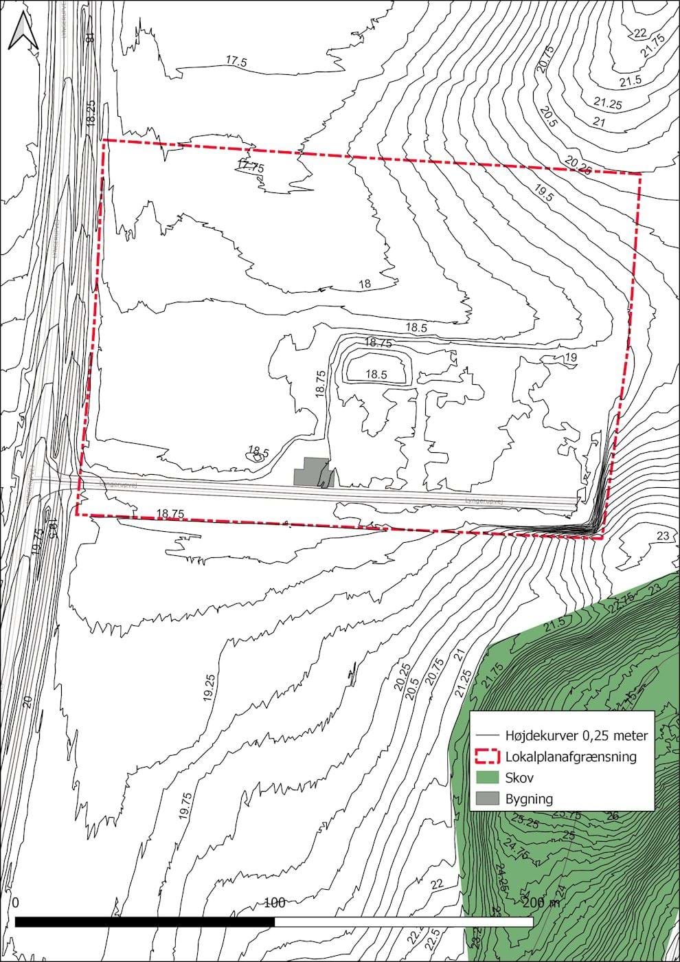 Kortbilag 3 viser højdekurver i interval på 0,25 meter i DVR90 inden for lokalplanafgrænsningen.