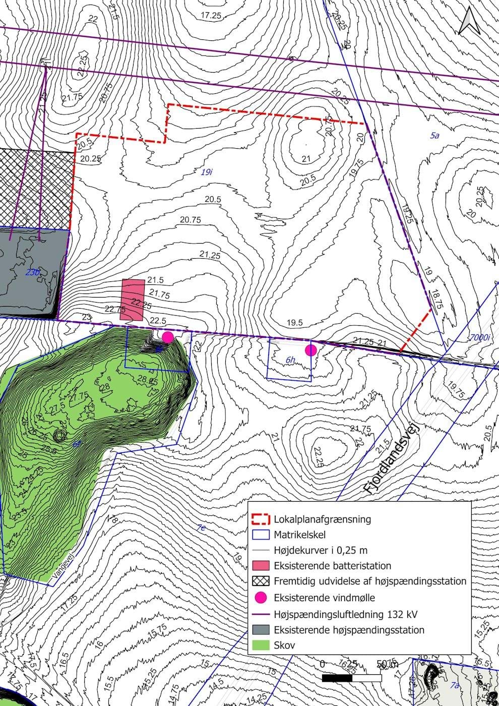 Kortbilag 1 viser lokalplansafgrænsning, terrænkurver, matrikler samt de eksisterende forhold i området
